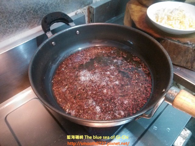 3. 炒鍋中放入芥花油,油熱後開小火,放入少許的花椒粒爆香;等待花椒粒顏色變黑褐色後,關火撈起花椒粒殘渣。