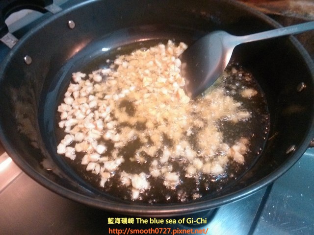 5. 然後換開小火放入切碎的蒜頭與辣椒然後慢慢拌炒。拌炒到開始沸騰並且出現泡泡,放入少許的鹽與冰糖調味,然後再拌炒至冰糖完全溶解,而且再度沸騰出現泡泡後就可以關掉爐火。