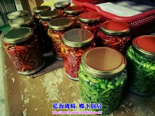 1. 先將辣椒洗淨晾乾,蒂頭去除,並以米酒與鹽醃製至少2個禮拜。